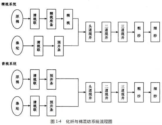 Quando o poliéster (ou outras fibras químicas) e o algodão são misturados, devido às diferentes propriedades e impurezas das fibras de poliéster e algodão, ele não pode ser misturado e processado no processo de carta de amor, sendo necessário fazer tiras de treliça, e então misture na primeira trefiladeira (mistura), para garantir a mistura são necessárias três faixas paralelas. O fluxo do processo de penteação geral e fiação de penteação é mostrado na figura abaixo.