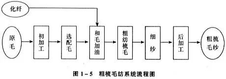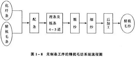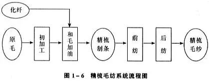 O sistema de fiação de lã penteada possui muitos processos e processos longos, que podem ser divididos em duas partes: tiras retas e fiação, e o fluxo do sistema de fiação é mostrado na figura abaixo.