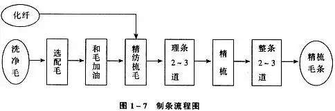 A fabricação de tiras penteadas, também chamada de fabricação de tiras de lã, pode montar uma fábrica separada, o produto (tiras de lã penteada) pode ser vendido como uma mercadoria, o processo de fabricação de tiras de lã é mostrado na figura abaixo.