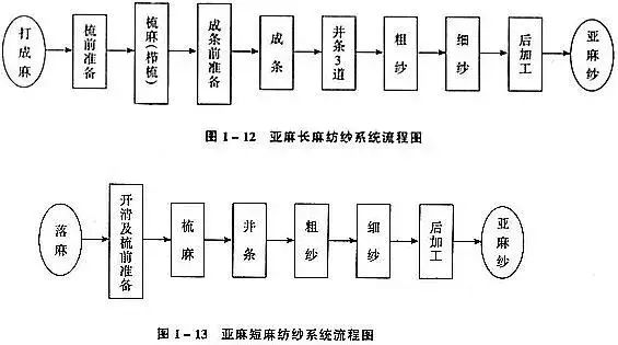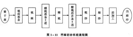 Geralmente, os sistemas de fiação de lã penteada ou seda são emprestados e apenas melhorias locais são feitas no equipamento. O cânhamo cru deve primeiro ser pré-tratado e processado em cânhamo fino, e seu processo de fiação é mostrado na figura abaixo; O rami curto e o larício geralmente podem ser processados por um sistema de fiação de algodão.